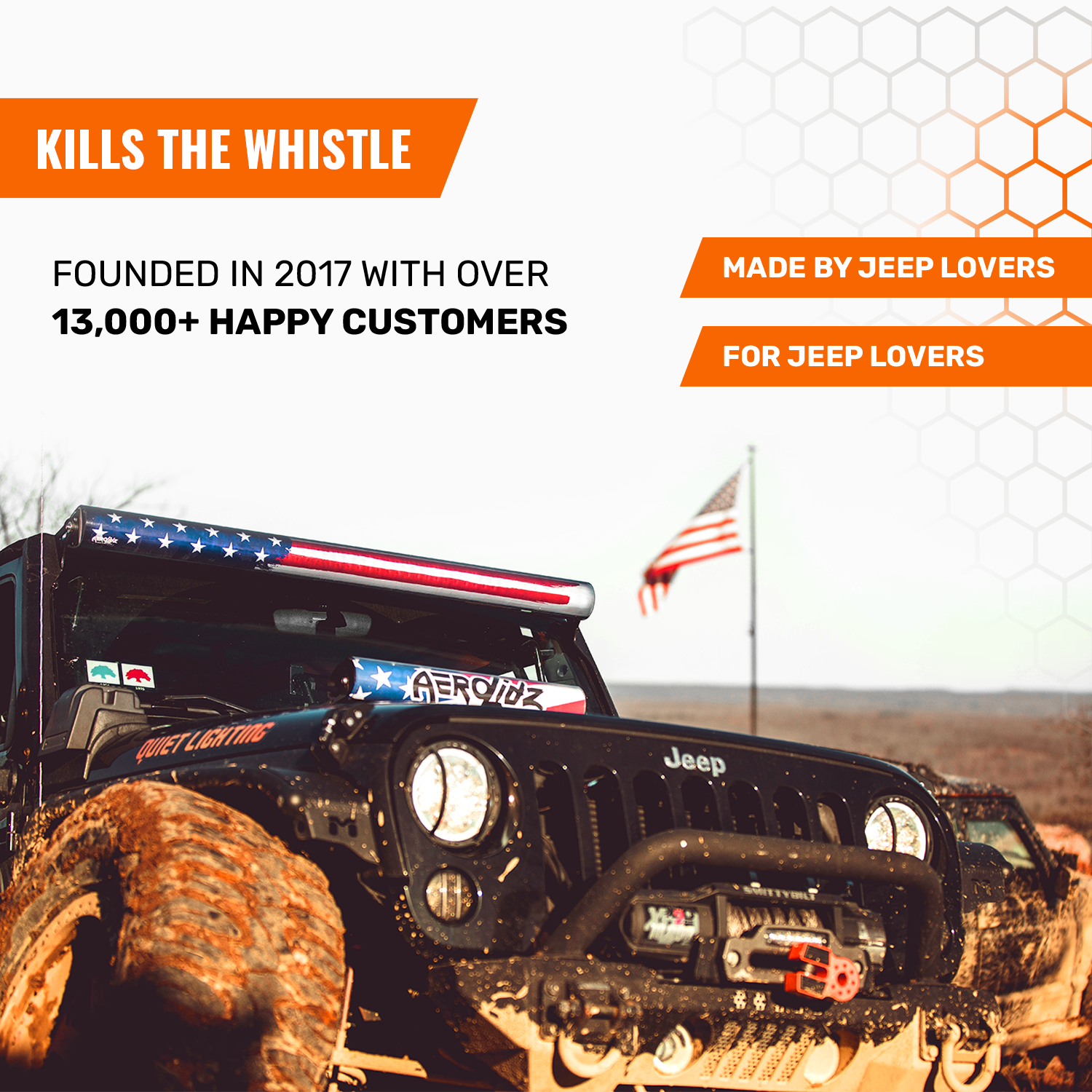 “In 2017, my wife gave me a light bar for Christmas. I installed it only to discover a horrible whistling noise. Was my light bar defective in some way? No! The whistling had been a huge problem with no real fix. At that moment I built the first prototype with some tape and PVC. Sprayed it black, put a cool bumper sticker on it, and took it for a ride. We effectively killed the whistle." - Gabe Warner